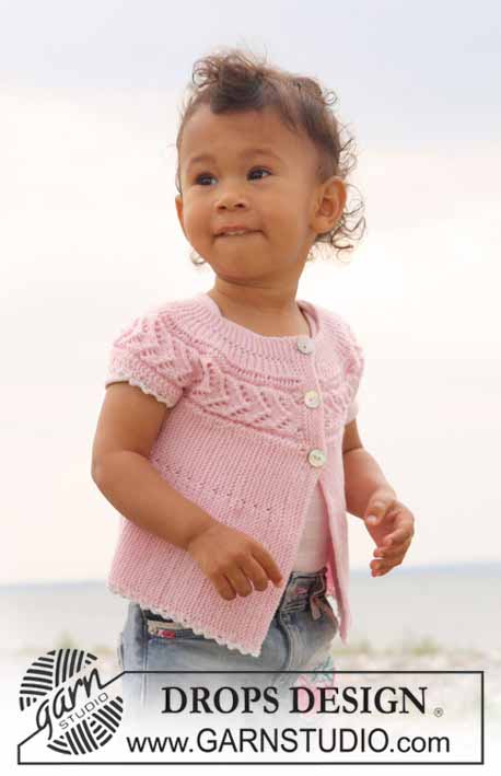 Blusa a maniche corte con bottoni lavorati da lato a lato a punto legaccio, motivo a buchi e ferri rotanti per neonati e bambini in DROPS Baby Merino.