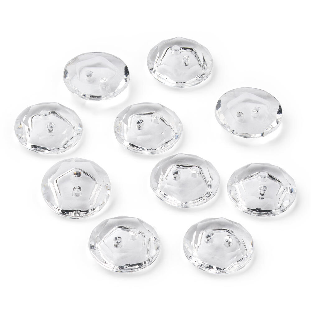 Set di 10 bottoni cristallo trasparenti in plastica, ciascuno con un diametro di 12 mm. La superficie sfaccettata cattura la luce in modo raffinato, donando un tocco elegante ai tuoi progetti.
