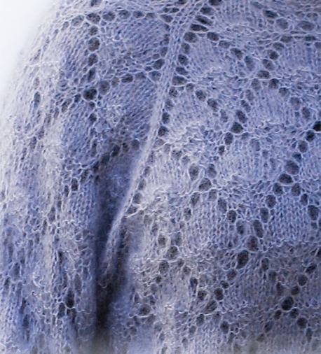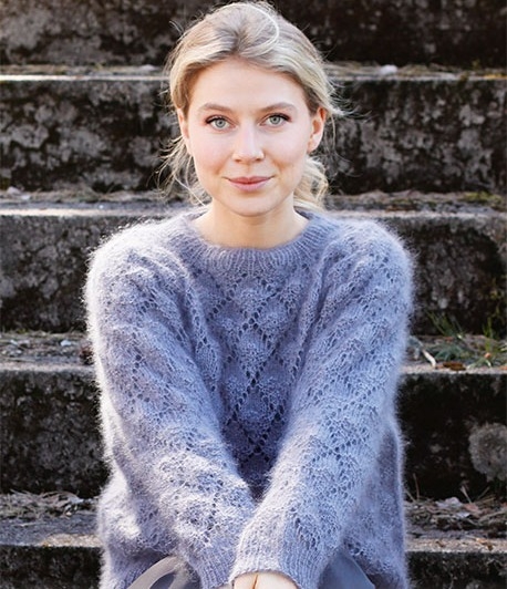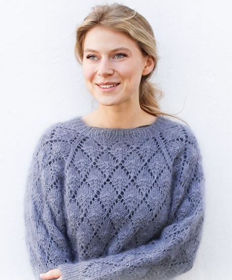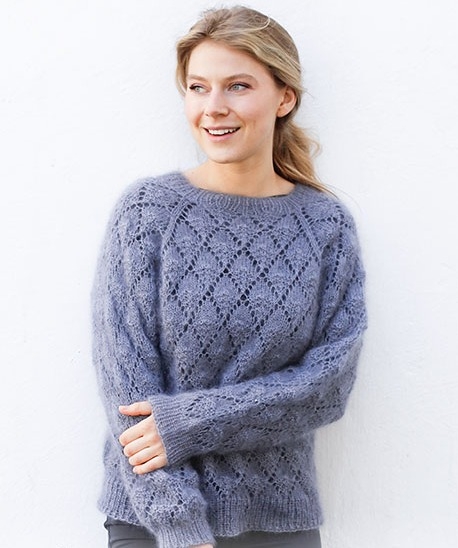 Il maglione Frosted Leaves è un bell'esempio di camicetta con un semplice motivo a fori, che risalta piacevolmente con l'uso di DROPS Brushed Alpaca Silk. Il modello semplice con foglie piccole e raglan è semplicissimo quando prendi solo la tecnica, ma sembra incredibilmente buono. Qui, la bella trama a sbuffo del filato può davvero risaltare bene. La camicetta può anche essere lavorata ai ferri in DROPS Kid-Silk , di cui puoi leggere di più qui
