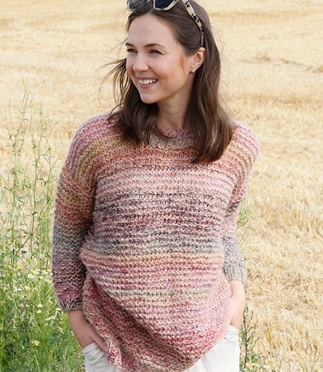 Nella blusa qui presente, Drops Brushed Alpaca Silk è combinato con DROPS Alpaca e DROPS Delight. DROPS Delight è un filato multicolore con un effetto davvero carino. Qui, Brushed Alpaca Silk DROPS aiuta a sfumare i colori e dona un aspetto più unisono. Il filato di alpaca dona anche una consistenza più soffice alla camicetta.