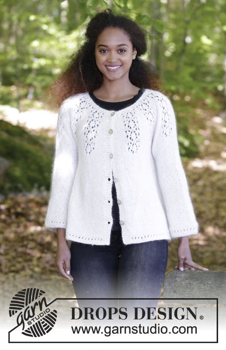 Giacca con trasporto rotondo, motivo a fori e forma ad A, lavorata dall'alto verso il basso. Taglia S - XXXL. Il lavoro è lavorato in DROPS Baby Merino e DROPS Kid-Silk .