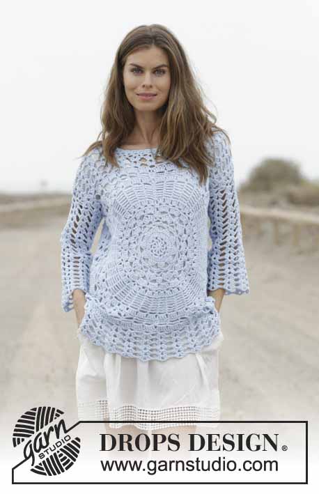 Camicetta all'uncinetto con motivo a fori, lavorare dal centro verso l'esterno. Taglia S - XXXL. Il lavoro è lavorato all'uncinetto in DROPS Paris Recycled Denim.