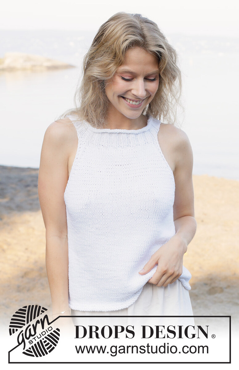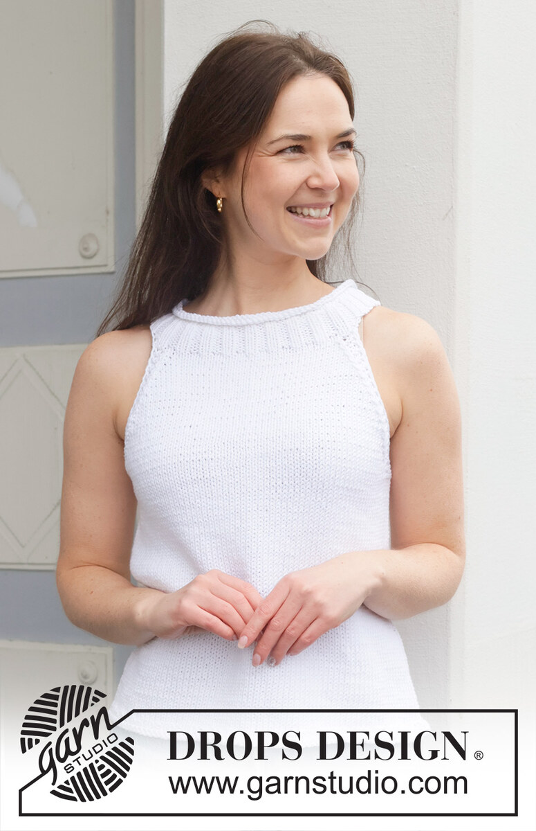 Top lavorato ai ferri in DROPS Paris. Lavorato dal basso verso l’alto a maglia rasata e bordi arrotolati. Taglie: XS - XXL.