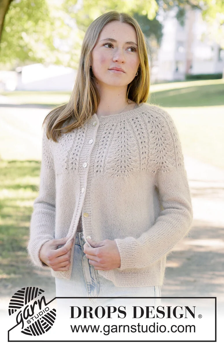 Cardigan lavorato ai ferri in DROPS Nord e DROPS Kid-Silk. Lavorato dall’alto in basso con sprone rotondo, motivo traforato e I-cord. Taglie: XS – XXXL.