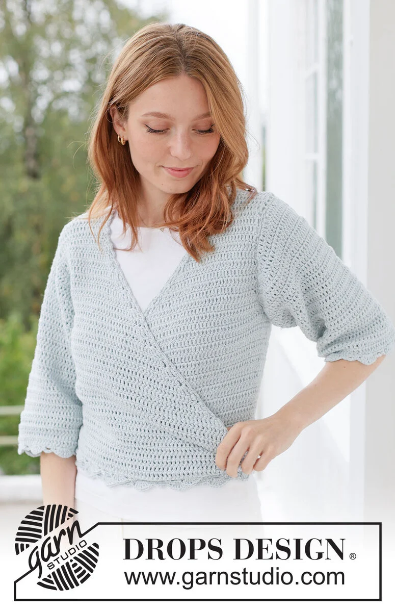 Cardigan lavorata all’uncinetto con maniche a ¾ in DROPS Belle. Lavorato dall’alto in basso con incrocio, bordi a ventaglio e bordi con cordini. Taglie: XS - XXXL.